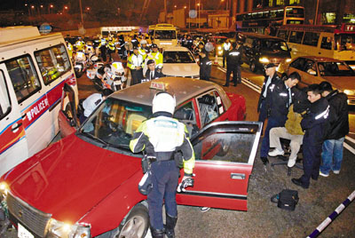 中新網(wǎng)1月25日電 香港一名司機涉嫌以偷來的士做無本生意多時,24日晚在銅鑼灣因沖紅燈惹起交警注意后逃走,結(jié)果掀起一幕由港島追到九龍全長22公里的警匪飛車追逐戰(zhàn),賊的士后于東隧九龍出口收費廣場撞毀一部電單車及一部警車后始停下,亡命司機當場束手就擒,但共有7名警民受傷送院,包括的士司機。