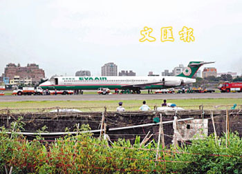 臺(tái)灣長(zhǎng)榮航空編號(hào)B-17913接駁機(jī)15日由桃園飛往高雄,因機(jī)翼輪胎爆胎,迫降高雄國(guó)際機(jī)場(chǎng)。 (圖片來(lái)源:文匯報(bào))