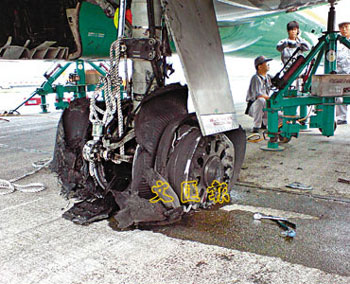 飛機(jī)其中一個(gè)輪軸嚴(yán)重受損。(圖片來(lái)源:文匯報(bào))