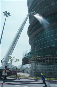 起火位置火勢一度猛烈,滾滾黑煙從地盤涌出街外,直卷半空,遠(yuǎn)至立法會大樓也可清楚看見,狀甚嚇人。事發(fā)于16日下午1時許,大批消防員、救護(hù)員及治安警接報趕抵現(xiàn)場,消防員到場即在亞馬喇圓形地近舊澳氹大橋口升起云梯向著火的棚架及安全網(wǎng)射水撲救,防止火勢蔓延。