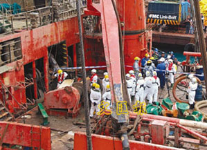 大批災(zāi)難辨認(rèn)小組警員在補(bǔ)給船上進(jìn)行搜尋尸體工作。(圖片來源:文匯報(bào))