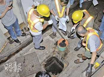 但街坊稱,兇案現(xiàn)場樓下的地產(chǎn)鋪和牛仔褲鋪的污水渠,近日傳出如“死老鼠“般惡臭。渠務署職員8日與探員到石硤尾現(xiàn)場一帶的沙井搜查,探員倒入化學顯影劑后利用弧光燈搜索,撈起兩團懷疑碎肉,又收集了4盆淤泥,全部帶返警署調(diào)查。