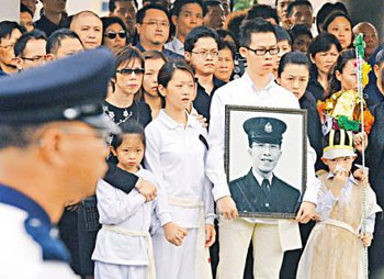 資料圖:香港尖沙咀槍擊案殉職警員曾國恒,以警隊最高規(guī)格舉行喪禮,儀式于世界殯儀館舉行,由曾國恒生前的同袍扶靈。 中新社發(fā) 譚達明 攝