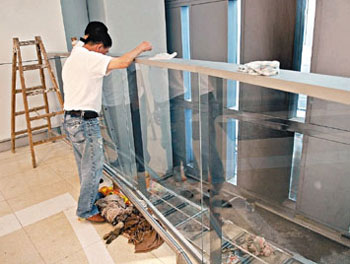 香港機(jī)場(chǎng)管理局早前聘請(qǐng)承辦商進(jìn)行防漏工程,工人需撬開(kāi)大樓內(nèi)外的玻璃幕墻旁地板,再鋪以防漏漆,其中在大樓外的工程已大致完成,工人正展開(kāi)樓內(nèi)工序。