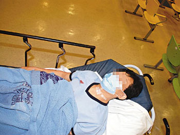 此時,有人突然情緒激動,順手拿起臺上一柄20公分長水果刀向妻子襲擊,直刺向她的喉嚨,藍(lán)某當(dāng)場受傷倒臥血泊中,男戶主疑畏罪以利刀自割頸部尋死。