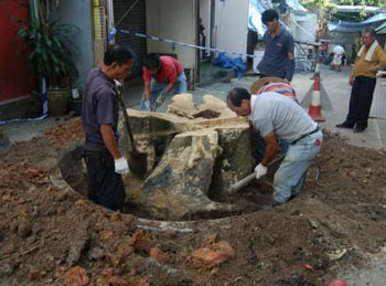 由于樹干直徑粗近兩尺,工人要鋸成片狀,再寫上編號(hào)運(yùn)走,等待日后重組樹型追查被侵蝕和倒塌原因。部分樹干的中央位置被蟲蛀出現(xiàn)“空心”,大量類似螞蟻的昆蟲因巢穴被毀爬行而出。