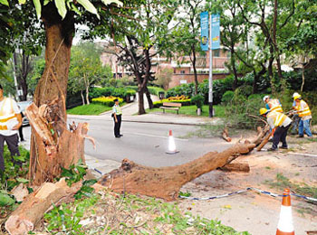 中新網(wǎng)9月3日電 據(jù)香港文匯報報道,香港赤柱繼上周三發(fā)生百年古樹砸死19歲香港大學(xué)女生莊頌賢后,附近赤柱村道2日也出現(xiàn)另一棵呈V形生長逾60年樹齡老樹,也因被侵蝕過度有半邊大樹倒下,幸好沒有造成傷亡。