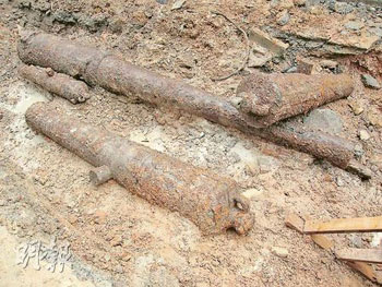 中新網(wǎng)9月19日電 據(jù)香港明報(bào)報(bào)道,香港金鐘英國(guó)駐香港總領(lǐng)事館對(duì)面地盤,挖出4支共重3噸的生銹大炮。爆炸品處理課人員檢查后,證實(shí)為沒有殺傷力的戰(zhàn)前古炮。