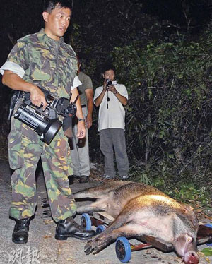 中新網(wǎng)9月19日電 據(jù)香港大公報(bào)報(bào)道,18日,一頭野豬闖入香港元朗牛潭尾民居,爆發(fā)“人豬大戰(zhàn)”。一頭重200斤的野豬進(jìn)村覓食時(shí)受驚,誤闖村屋空地,戶(hù)主及街坊等四人分持斧頭、犁耙合力捕捉,結(jié)果三人受傷,最后將野豬困鎖在廁所。警員接報(bào)趕至封鎖現(xiàn)場(chǎng),狩獵隊(duì)入村將野豬射殺。