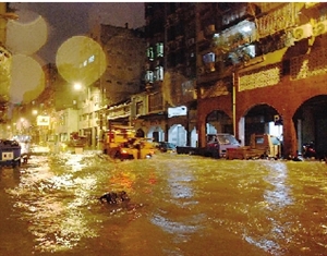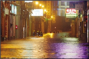 澳門沿岸海面23日現(xiàn)驚濤駭浪,漁船紛回港暫避。內(nèi)港、新馬路一帶晚上10時后出現(xiàn)海水倒灌,加上傾盆暴雨,路面最高水深至小腿。新馬路內(nèi)街出現(xiàn)水浸,電箱冒煙,大廈停電。福隆新街一帶水浸嚴(yán)重,高達(dá)1米,浸過變電站,電力公司被逼關(guān)閉電源,一帶商鋪全部被淹,料損失嚴(yán)重。