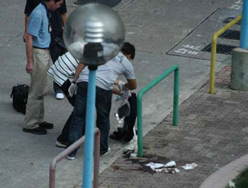青年再拔足逃跑,走到約100米外長(zhǎng)亨村休憩公園,期間似欲接近一名老婦,警長(zhǎng)追至再高呼“放下刀,不然就開槍”,但無效,于是再開第二槍。青年左臀部中彈流血蹲在地上,但有人仍一度緊握水果刀。兩警員繼續(xù)擎槍,另一名警員則手持警棍監(jiān)視,有增援警員趕至也將手按在槍袋,氣氛緊張。