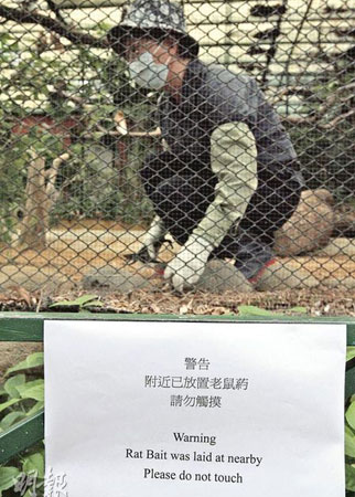 據悉,園內9號鳥籠是鼠患重災區(qū),內里11種珍貴鳥類常與鼠為伴,而靠近紅棉道的鳥籠則飼養(yǎng)了一批林鴛鴦,但日前草叢內卻發(fā)現最少兩具鼠尸。康文署23日派員入籠清理,并在場內除去雜草及噴灑消毒劑,又在園內貼出告示,提示游客不要接觸已放置的鼠藥。