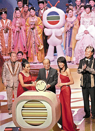 大會(huì)安排兩位司儀汪明荃和鄭裕玲穿著紅色晚裝,實(shí)行像兩封紅利是左右伴著年屆101歲的TVB行政主席邵逸夫爵士(六叔)主持亮燈儀式。