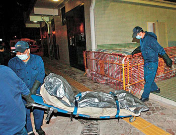 仵工將墮樓中大女生的尸體移送殮房。(圖片來源:蘋果日?qǐng)?bào))