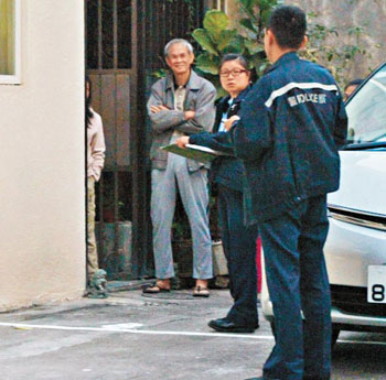 男戶主陳通美(左)走出單位協(xié)助調(diào)查。(圖片來(lái)源:蘋果日?qǐng)?bào))