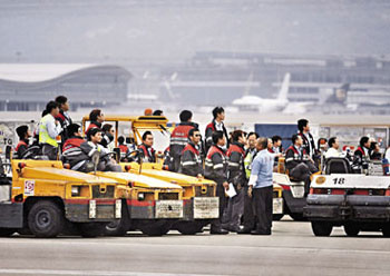 上月底,因?yàn)橘Y方停發(fā)“工作表現(xiàn)獎”,機(jī)場地勤服務(wù)公司員工進(jìn)行歷時3小時的“警示式罷工”,半癱瘓機(jī)場6小時;在香港勞工處斡旋下,勞資雙方5日進(jìn)行談判。