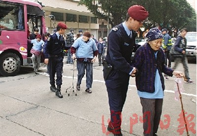 有人報(bào)警求助,多名警員到場調(diào)查。由于旅游巴上的14名長者行動(dòng)不便,要在安老院人員和警員攙扶到另一大巴,有長者更需乘坐輪椅。