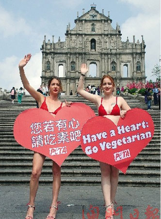 兩名性感內(nèi)衣女郎12日中午12時現(xiàn)身旅游旺區(qū)——大三巴牌坊,兩人手持心形的“您若有心,請吃素吧”標語。兩人是善待動物組織成員,來到澳門主要傳遞“素食對身心均有益處”和“吃素是對我們自己、動物及地球最好的情人節(jié)禮物”等訊息。