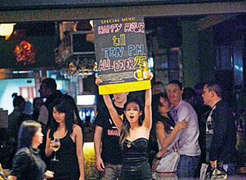 金融海嘯令香港酒吧生意一落千丈,美國軍艦這次訪港,預計會帶旺尖沙咀、灣仔及銅鑼灣一帶的消費,特別為區(qū)內的酒吧帶來“及時雨”。不少酒吧東主得悉有大批美軍抵港,如久旱逢甘露,有酒吧更在門外掛上美國國旗作招徠,而大批衣著性感女郎,比平時更早“開工”,未及黃昏已經在街頭向途經大兵拋媚眼。
