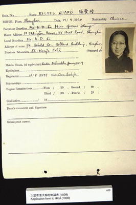這次展覽的多數(shù)展品,是由宋以朗先生提供,如有張愛玲親筆簽名的《傾城之戀》等著作以及《談色.戒》初稿。“初稿”表露張愛玲回應(yīng)刊于當(dāng)年臺灣《中國時報(bào)》內(nèi)署名“域外人”對《色.戒》的批評。是次展覧,香港大學(xué)則展示了張愛玲的入學(xué)證明,上面附有她戴著圓厚眼鏡的學(xué)生照。但上面的出生日期為九月十九日,與后來她申請美國綠卡時所填的九月三十日不同。