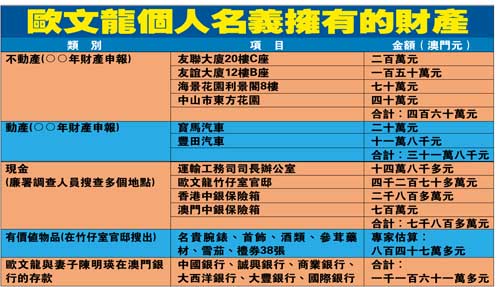 上述銀行保險箱鎖匙、單據(jù)、公司印章等物,大部分能在歐文龍官邸內(nèi)搜出。在歐記載于去年十月四日“友好手冊”的財產(chǎn)統(tǒng)計表,羅列款項(xiàng)達(dá)七億五千○一萬澳門元(未計不動產(chǎn)),這與廉署搜出的黃色便條紙所列的財產(chǎn)一致,經(jīng)核對資金記錄的款項(xiàng)加減情況,發(fā)現(xiàn)有關(guān)數(shù)字極之脗合。連同不動產(chǎn)一倂計算,歐文龍總資產(chǎn)高達(dá)八億五千二百五十二多萬元。