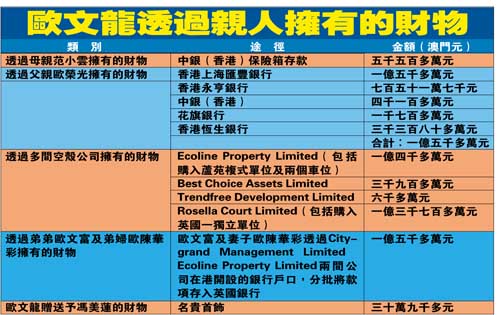 調(diào)查發(fā)現(xiàn),歐文龍透過其親屬,包括已故的母親范小云、父親歐榮光、弟弟歐文富及弟婦歐陳華彩等在港開設(shè)的保險箱及賬戶,以及所操控的五家空殼公司,轉(zhuǎn)移巨額不法資產(chǎn)。