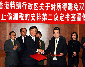香港財經(jīng)事務(wù)及庫務(wù)局局長陳家強30日在北京,與國家稅務(wù)總局副局長王力簽訂《第二議定書》。這是內(nèi)地與香港及其它地區(qū)簽訂全面性避免雙重征稅安排或協(xié)定后,首次就修訂安排或協(xié)議的條款簽訂議定書,對于將來落實執(zhí)行安排或協(xié)議具有重要意義。