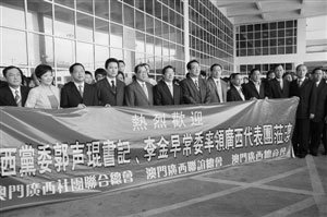 中新網(wǎng)4月21日電 據(jù)澳門(mén)日?qǐng)?bào)報(bào)道,由廣西壯族自治區(qū)黨委書(shū)記郭聲琨率領(lǐng)的訪澳招商考察代表團(tuán)一行,20日上午10時(shí)許經(jīng)外港碼頭抵澳,澳門(mén)經(jīng)濟(jì)財(cái)政司司長(zhǎng)譚伯源、澳門(mén)廣西社團(tuán)聯(lián)合總會(huì)會(huì)長(zhǎng)何玉棠、澳門(mén)廣西總商會(huì)會(huì)長(zhǎng)羅盛宗,以及兩個(gè)總會(huì)約500名會(huì)員、鄉(xiāng)親,在場(chǎng)歡迎廣西代表團(tuán)的到來(lái)。