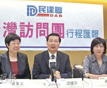 中新網(wǎng)6月12日電 據(jù)香港明報(bào)報(bào)道,香港民建聯(lián)成員完成兩天訪臺(tái)行程返港,民建聯(lián)主席譚耀宗11日總結(jié)時(shí)表示,臺(tái)灣“陸委會(huì)”官員提出港府在臺(tái)灣設(shè)立辦事處的可能,以處理港人在臺(tái)的“救難解急”事項(xiàng)。