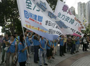 資料圖:九月香港立法會選舉七月十九日開始接受提名,選舉事務(wù)處總共接獲三十八份提名表格。圖為民建聯(lián)在長沙灣區(qū)舉行宣傳儀式,民建聯(lián)全部二十九位參選人聯(lián)同二百人助選團出席報名儀式,為大家打氣加油。 中新社發(fā) 張勤 攝