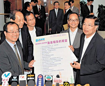 民建聯(lián)多位現(xiàn)任和候任立法會(huì)議員10日應(yīng)曾蔭權(quán)邀請(qǐng)發(fā)表《施政報(bào)告》意見(jiàn)。譚耀宗說(shuō),特別向曾蔭權(quán)提出,在適當(dāng)時(shí)間安排新一屆立法會(huì)議員到訪內(nèi)地,例如到上海參觀世界博覽會(huì),但沒(méi)有提及特定的時(shí)間表。