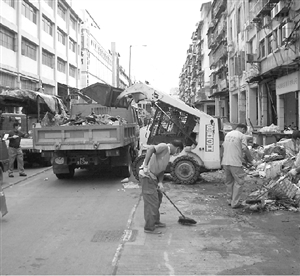 清潔工人利用大型機(jī)械及車輛移走垃圾。(圖片來源:澳門日報(bào))