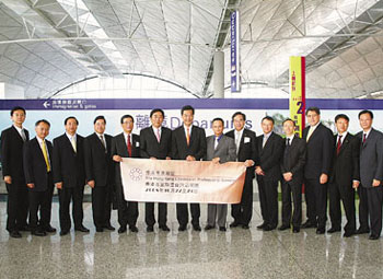 圖為港專聯(lián)臺灣訪問團離港時,中華旅行社總經(jīng)理楊家駿(左6)及遠東貿(mào)易服務中心主任嚴重光(左8)到機場送行。(圖片來源:文匯報)