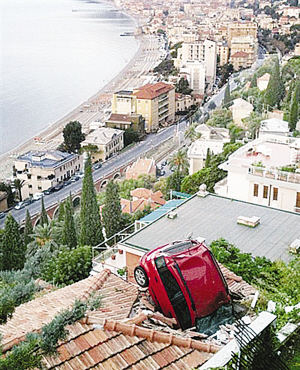 瑪麗亞光顧著拍照片,忘記拉手剎,結(jié)果車子從馬路上一路滑到了山底下,倒栽在一間民宅的屋頂上。