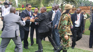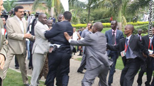 峰會第一天,利比亞總統(tǒng)衛(wèi)隊即與烏干達安全人員發(fā)生了拳腳沖突。根據(jù)CNN記者薩曼森納塔爾的描述,當時正要舉行峰會開幕式。按照規(guī)定,只有國家首腦被允許進入會場。利比亞總統(tǒng)衛(wèi)隊試圖護送卡扎菲通過入口,遂與烏干達安全人員發(fā)生爭論,隨后升級為肢體沖突,但是雙方?jīng)]有動槍。