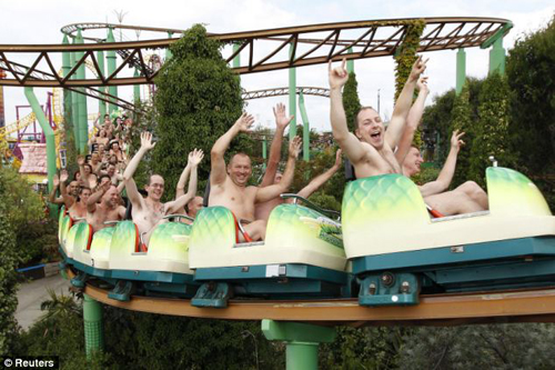 中新網(wǎng)8月9日電 據(jù)英國媒體報道,當?shù)貢r間8月8日,102名英國男女齊聚艾塞克斯郡冒險島游樂園,將衣服全部脫掉,體驗裸體乘坐“綠色尖叫”過山車的刺激感覺。這102人也創(chuàng)造了一項新的世界紀錄。