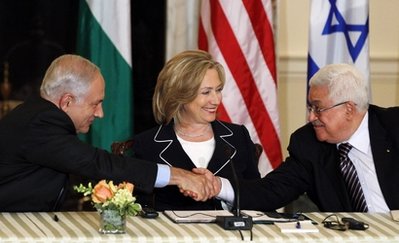 在美國國務(wù)卿希拉里的主持下,巴勒斯坦領(lǐng)導(dǎo)人阿巴斯和以色列總理內(nèi)塔尼亞胡自2008年年底后第一次坐在同一張談判桌前,著手就以色列定居點、耶路撒冷歸屬等最終地位問題展開直接談判,以結(jié)束雙方數(shù)十年的沖突并實現(xiàn)“兩國方案”。