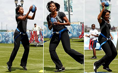 現(xiàn)在,這位備受關(guān)注的第一夫人又以身作則,她加入到由印第安納波利斯小馬隊(duì)教練托尼·唐奇、前坦帕灣海盜隊(duì)線衛(wèi)德里克·布魯克斯等橄欖球明星發(fā)起的旨在倡導(dǎo)青少年健康生活的美式橄欖球運(yùn)動,在學(xué)生們面前大展她運(yùn)動的天賦。