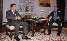 中新網(wǎng)10月11日電 據(jù)俄新網(wǎng)報道,11日,俄羅斯總統(tǒng)德米特里·梅德韋杰夫在戈?duì)柣偨y(tǒng)官邸接見美國加里福尼亞州州長阿諾·施瓦辛格。