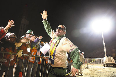 第2名被救出的礦工馬里奧無(wú)疑是最激情四射的一位。馬里奧在快要到達(dá)井口時(shí)就開始與地面上的礦友喊起了玩笑話,聲音洪亮,充滿激情。在成功升井之后,馬里奧表情輕松的走下救生艙,與家人擁抱。他把含有金粒的礦石遞給救援人員表示感謝。