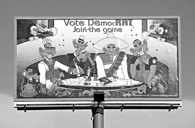 一幅位于美國(guó)科羅拉多州梅薩縣的大型選舉廣告牌惹來爭(zhēng)議。該廣告牌將奧巴馬描繪成伊斯蘭自殺式炸彈襲擊狂徒、同性戀者、抽雪茄的歹徒和墨西哥土匪,并畫上幾只身上寫上律師、美國(guó)國(guó)家稅務(wù)局(IRS)、國(guó)家環(huán)境保護(hù)署(EPA)和美聯(lián)儲(chǔ)的大老鼠,諷刺他們和奧巴馬蛇鼠一窩。
