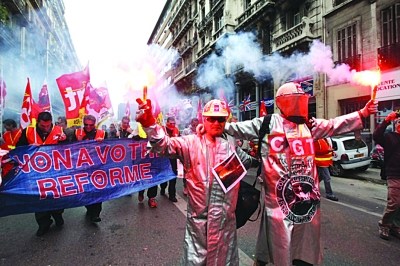 由于法國總統(tǒng)薩科齊執(zhí)意進行養(yǎng)老金改革,即準(zhǔn)備將最低退休年齡由60歲延長至62歲,領(lǐng)取全額政府退休金的年齡則從65歲提高至67歲。這讓法國工會組織十分不滿。為了逼迫政府讓步,連日來,他們發(fā)動了數(shù)次罷工和示威游行。截至當(dāng)?shù)貢r間16日,罷工潮已席卷法國大多數(shù)地區(qū)。