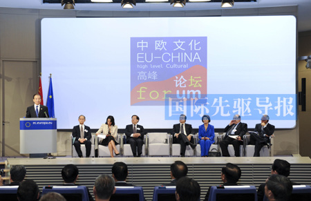 這是10月6日舉行的首屆中歐文化高峰論壇現(xiàn)場(chǎng)。為期兩天的論壇由中國(guó)文化部、歐盟委員會(huì)對(duì)外關(guān)系總司和教育文化總司共同主辦。開(kāi)幕式當(dāng)天,和歐盟委員會(huì)主席巴羅佐一起出席論壇的中國(guó)總理溫家寶意味深長(zhǎng)地發(fā)表演講說(shuō):“文化交流比政治交流更久遠(yuǎn),比經(jīng)濟(jì)交流更深刻!