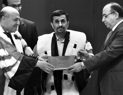 14日上午,內賈德在位于貝魯特的黎巴嫩大學受到了師生們的熱烈歡迎,并被授予政治學榮譽博士學位。黎教育部長和黎巴嫩大學校長為他披上博士服并頒發(fā)了學位證書。獲得博士學位的內賈德激動不已,當場向學生們發(fā)表講話。他說:“我們相信真正的科學會為人類、和平、愛和友誼服務。”
