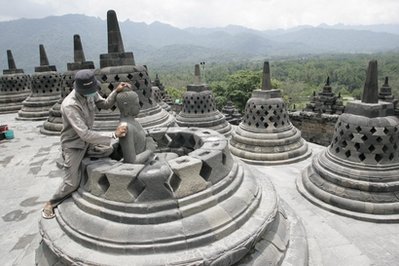 據(jù)報(bào)道,由于位于中爪哇省馬格朗縣日惹東北32公里的默拉皮火山26日開始大規(guī)模噴發(fā),位于鄰近地區(qū)的婆羅浮屠佛塔也被大量火山灰覆蓋。當(dāng)局從當(dāng)日起就對(duì)景點(diǎn)實(shí)行限進(jìn)措施,并組織專人清掃覆蓋在佛塔建筑上的火山灰。
