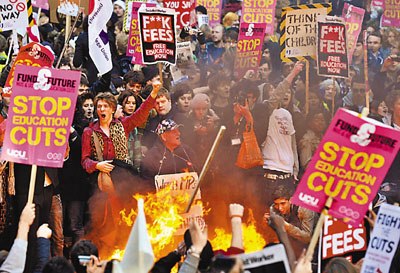 中新網(wǎng)11月12日電 據(jù)香港《文匯報》12日報道,英國10日爆發(fā)首場反對財政緊縮措施的暴力示威,5萬名學(xué)生在首都倫敦上街抗議,反對政府削減教育開支,并大幅上調(diào)每年學(xué)費至9000英鎊(約合9.6萬元人民幣),是現(xiàn)水平的3倍。后來,示威演變成暴力沖突,部分人沖進(jìn)保守黨總部大樓,破壞接待處和大堂,有人從天臺投擲雜物。事件中有14人受傷,32人被捕。首相卡梅倫譴責(zé)了此次事件,稱不能接受暴力行為。