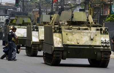 最少10輛配備點(diǎn)50口徑機(jī)關(guān)槍的“M113”裝甲車,隆隆駛過里約熱內(nèi)盧市中心街頭,長驅(qū)直進(jìn)開往該市北面的克魯賽羅貧民窟。當(dāng)局從來未試過出動(dòng)這種重裝備對(duì)付毒販,今次十足打仗一樣,許多居民都嚇了一跳。