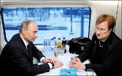 俄羅斯與芬蘭之間首條高速鐵路12日正式開(kāi)通,俄羅斯總理弗拉基米爾·普京和芬蘭總統(tǒng)塔里婭·哈洛寧共同乘坐首班列車。普京在下車后開(kāi)玩笑說(shuō),由于車速過(guò)快,他和哈洛寧都沒(méi)有足夠時(shí)間交談。這條鐵路是連接俄羅斯和歐洲其他國(guó)家的首條高鐵。