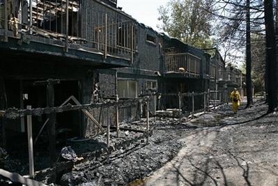 加州斯托克頓一排已被燒毀的房屋。