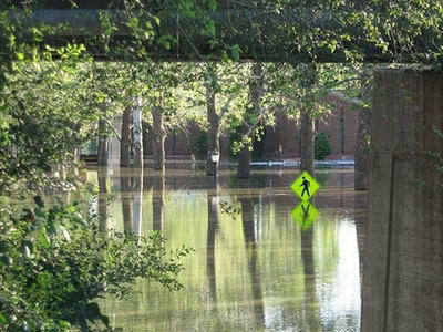 愛(ài)荷華市的洪水水位仍在上升,圖為該市大學(xué)藝術(shù)學(xué)院校園道路指示牌。